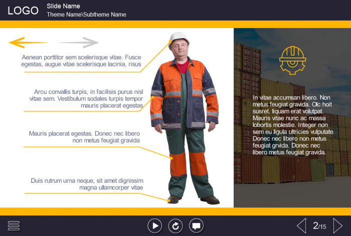 Construction Workers Overview — Storyline Template. An unique elearning interaction contains two workers standing straight. The user must click on the left and right arrows to reveal the information about each person. The photos of cutout people are used to grab learners’ attention. The Storyline Template would be a great choice to create a powerful training course.