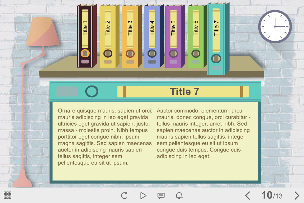 Storyline Clickable Colored Folders Template. Designed in variegated colors, this unique elearning interaction will surely help you to present the course information in a creative way. It contains 7 clickable tabs designed in the form of classic colored folders. The user must click on each folder to reveal the training materials. The Storyline Template would be a great choice to create a powerful training course.