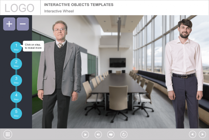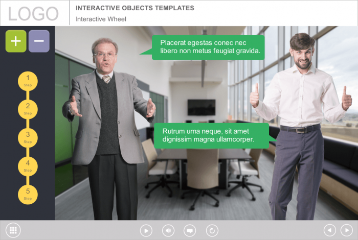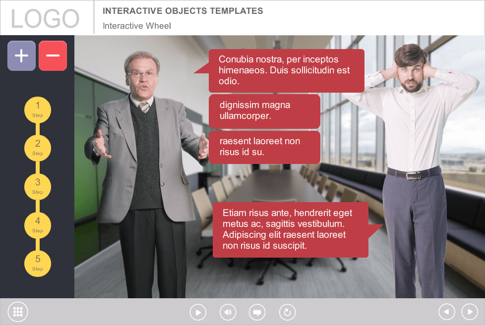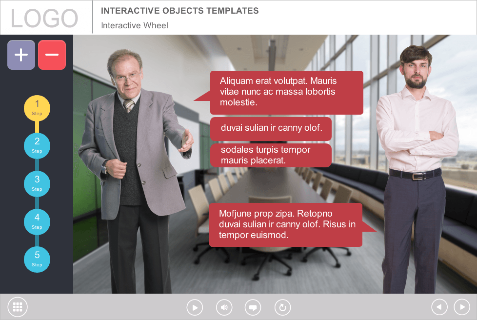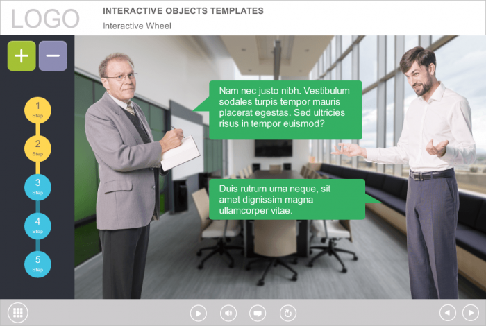Storyline Conversation Between Business Partners Template. Designed with Articulate Storyline 2 software and fully compatible with most latest versions such as Articulate Storyline 3 and 360. There are two life size cutout characters talking to each other. The user is able to view the samples of correct and incorrect construction of the business conversation reinforced with the corresponding emotional reaction of the characters. It is already designed and prepared fot usage.