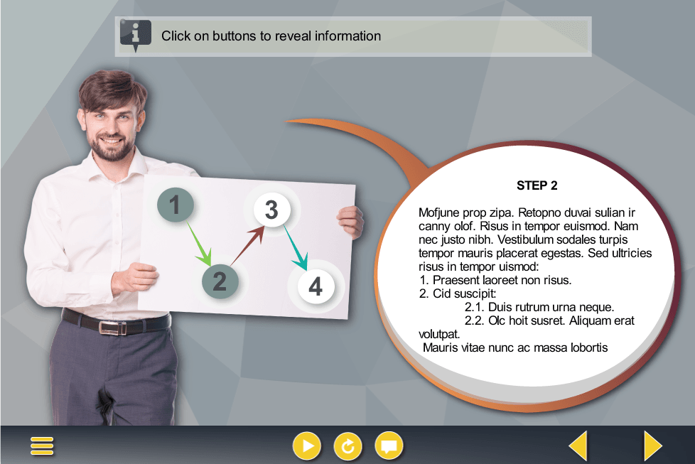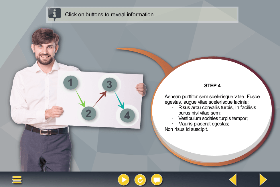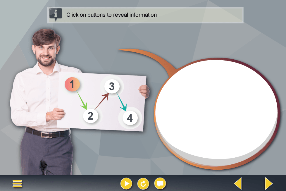Storyline Round Buttons Over Businessman’s Board Template. Designed with Articulate Storyline 2 software and fully compatible with most latest versions such as Articulate Storyline 3 and 360. The interactive slide contains 4 round buttons, invented to reveal the learning materials. The cutout photo of a smiling young businessman with a white board is used to illustrate the course narrator. The template is already designed and prepared fot usage.