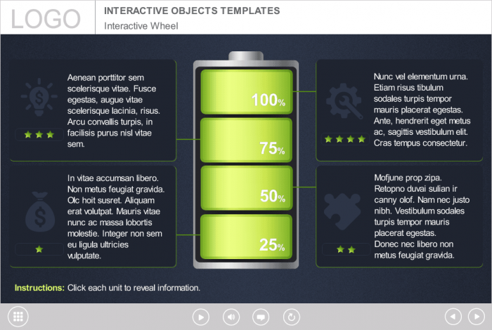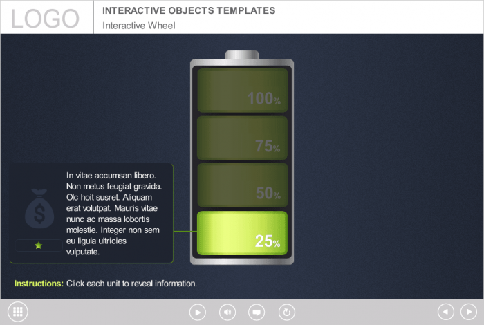 Storyline Battery Charging Stages Template. The unique storyline interaction is designed with Articulate Storyline 2 and is fully compatible with the most recent versions – Storyline 3 and 360. It contains 4 clickable elements which are invented to reveal additional information. Designed in black and dark gray colours, this Storyline Template would be a great choice to increase learner’s attention in the training process. It’s a ready-to-use product that perfectly runs on both PC and mobile devices with screen size larger than 7 inches. We’ve collected a huge variety of Articulate Storyline templates especially for eLearning developers. Now it will become even easier to create an electronic course “from scratch”.