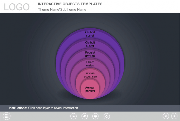 Storyline Clickable Layers Template. The unique storyline interaction is designed with Articulate Storyline 2 and is fully compatible with the most recent versions – Storyline 3 and 360. It contains 6 clickable items invented to reveal the course information. Designed in black and dark gray colours, this Storyline Template would be a great choice to increase learner’s attention in the training process. It’s a ready-to-use product that perfectly runs on both PC and mobile devices with screen size larger than 7 inches. We’ve collected a huge variety of Articulate Storyline templates especially for eLearning developers. Now it will become even easier to create an electronic course “from scratch”.