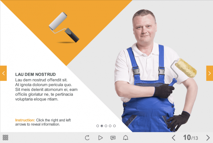 Construction Tools Slideshow — Storyline Template is composed of 5 slides with text and image materials about different building tools. The user must click on the left and right arrow buttons to switch between the slides. This unique eLearning template contains few cutout photos of a mid-aged worker dressed in builder uniform. It is designed with Articulate Storyline 2 software. It is fully compatible with the most recent versions: Storyline 3 and 360.
