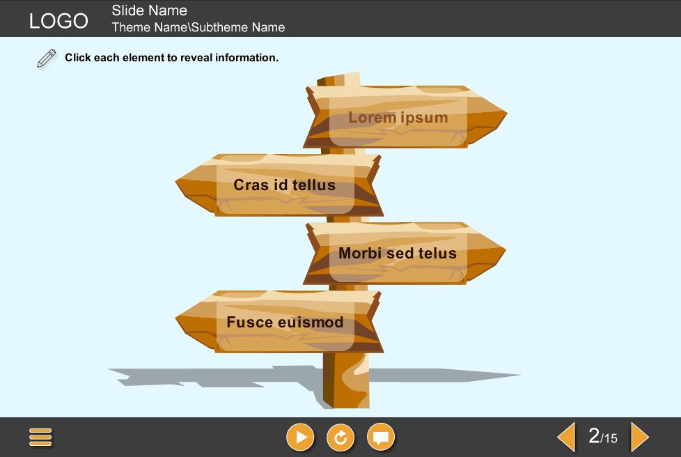 Wooden Signpost — Storyline Template. The unique storyline interaction is designed with Articulate Storyline 2 and is fully compatible with the most recent versions – Storyline 3 and 360. It contains the interactive signpost that is composed of 4 buttons. The user must click on each part to reveal the learning materials.