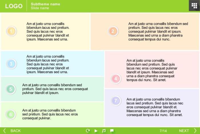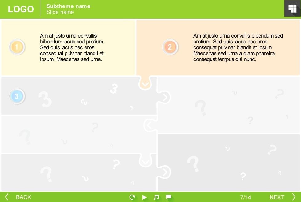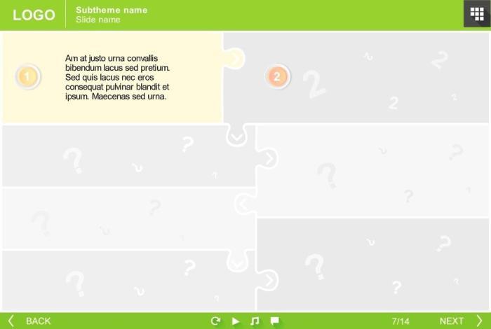 Jigsaw Puzzle with Numeric Buttons — Storyline Template. The well-designed interaction slide is composed of seven puzzle pieces with the question marks background. The user must click on each numeric button to reveal the additional information on the first puzzle piece and to open the next button. The template is a ready-made product: all you need to do is to insert the slide into your project and to add own learning materials to it. Being developed in the Storyline 2 authoring tool, the template is fully compatible with the recent Articulate Storyline 3 / 360. It launches well on both PCs and tablets.