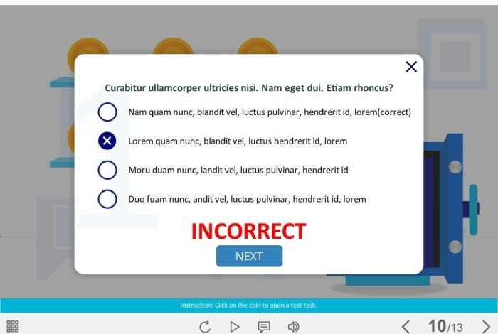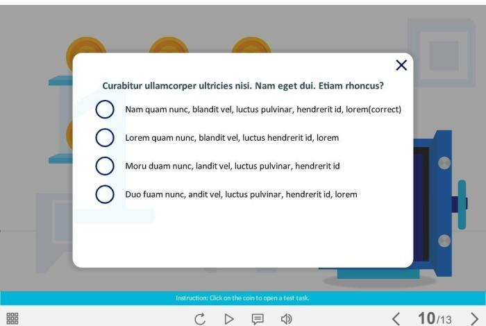 Put Coins in the Safe Vault — Storyline Template. The well-designed interaction slide contains six single choice questions with one correct answer and three incorrect answers. The user must open the coins sequentially and give the correct answers to all the questions to complete the quiz. The template would be a great helper to check learners knowledge in a gamified form. It is a ready-made product: all you need to do is to insert the slide into your project and to add own learning materials to it. Being developed in the Storyline 2 authoring tool, the template is fully compatible with the recent Articulate Storyline 3 / 360. It launches well on both PCs and tablets.
