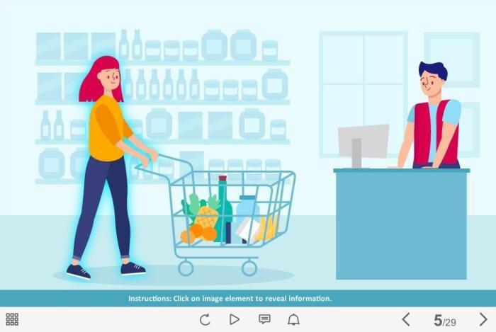 Supermarket Customer and Cashier — Storyline Template. The well-designed interaction slide contains three clickable objects: a customer, a super market trolley bag, and a cashier. The user must click on each of them to reveal the additional information. The template would be a great illustration for the customer support and service situations. It is a ready-made product: all you need to do is to insert the slide into your project and to add own learning materials to it. Being developed in the Storyline 2 authoring tool, the template is fully compatible with the recent Articulate Storyline 3 / 360. It launches well on both PCs and tablets.