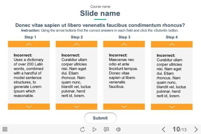 Slideshow Blocks Quiz — Storyline Template. The well-designed interaction slide is composed of four questions represented on the one slide. The user must choose the correct answers by clicking on the up and down arrows, and then check himself with the Submit button. It is possible to retry in case of an unsuccessful attempt. The template is a ready-made product: all you need to do is to insert the slide into your project and to add own learning materials to it. It is fully compatible with the recent Articulate Storyline 3 / 360 versions. Launches well on both PCs and tablets.