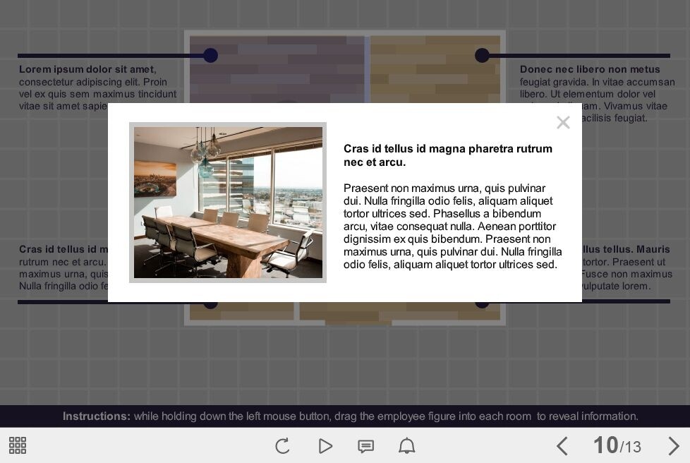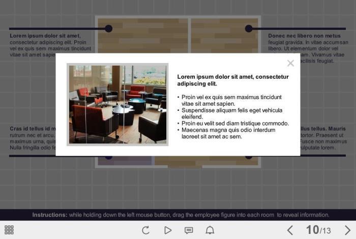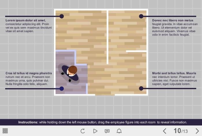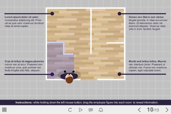 Four Rooms — Storyline Template. The well-designed interaction slide is composed of a draggable character and four rooms where the character can be moved. The user must drag the character to each room to reveal the additional information in pop-ups. The template is a ready-made product: all you need to do is to insert the slide into your project and to add own learning materials to it. Being developed in the Storyline 2 authoring tool, the template is fully compatible with the recent Articulate Storyline 3 / 360. It launches well on both PCs and tablets.