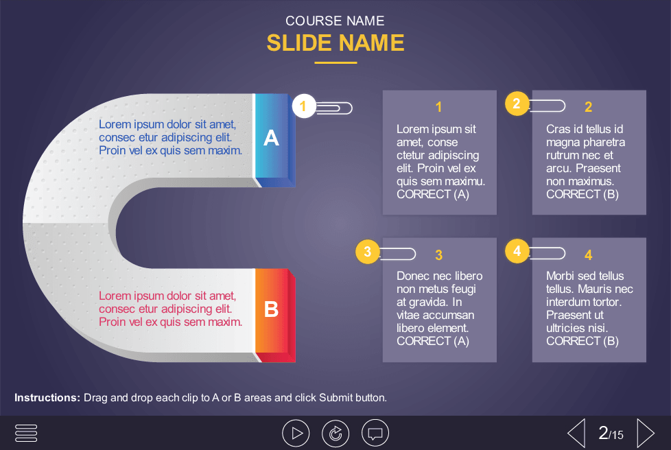 Horseshoe Magnet Quiz — Storyline Template. The unique eLearning template is designed with Articulate Storyline 2 authoring tool. It contains 4 draggable clips with the small text blocks. The learner must drag them to the appropriate fields of the magnet to complete the task. The interaction would be an excellent choice to check learner’s knowledge. The Storyline template is fully compatible with the Articulate Storyline 3 / 360 software. All you need is just to insert the template into your training project and fill it with own eLearning content. Try to use our fascinating templates to create better courses.