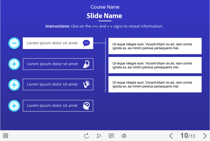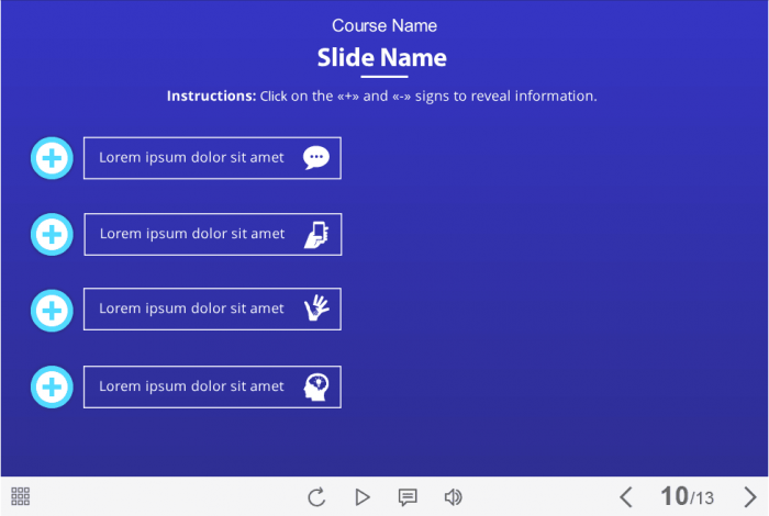 Clickable Plus and Minus Signs — Storyline Template. The template is designed with Articulate Storyline 2. It is fully compatible with Storyline 3 / 360 versions. The slide is composed of 4 clickable buttons designed in the form of the plus and minus signs. The user must click on them to reveal the additional information. This Storyline interaction would be a great choice to create amazing eLearning courses. All you need is to insert the slide into your project and to fill it with own training content. We’ve collected hundreds of Articulate Storyline templates which would become great helpers for eCourse developers.