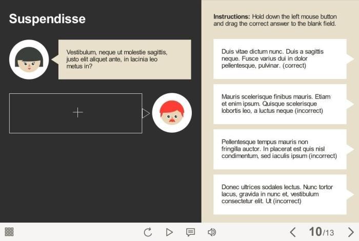 Messenger Quiz — Storyline Template. The unique eLearning template is designed with Articulate Storyline 2 authoring tool. It contains 5 single choice questions. The user must drag the correct answer to the appropriate field to complete each task and move to the next one. The interaction would be an excellent choice to check learner’s knowledge.