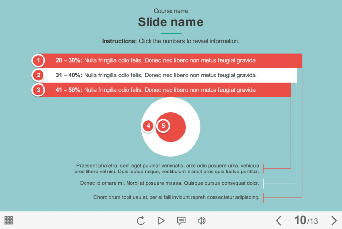 Click on Round Number Icons — Storyline Template. The template is designed with Articulate Storyline 2. It is fully compatible with Storyline 3 / 360 versions. The slide is composed of 5 round buttons with numbers. The user must click on each number to reveal the additional information. This Storyline interaction would be a great choice to create amazing eLearning courses. All you need is to insert the slide into your project and to fill it with own training content. We’ve collected hundreds of Articulate Storyline templates which would become great helpers for eCourse developers.