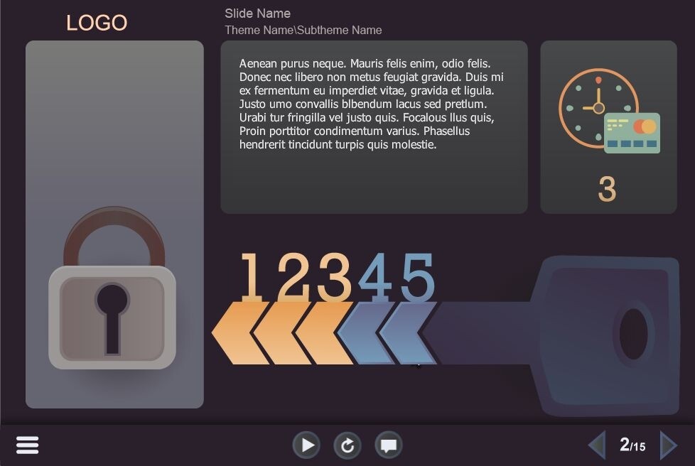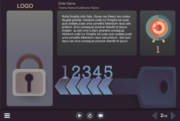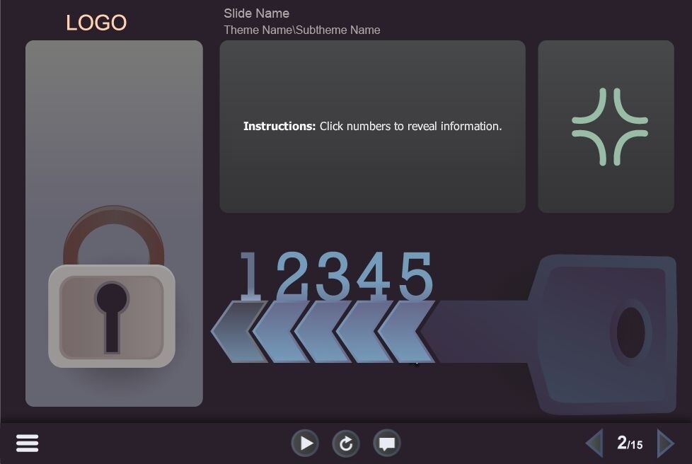 Padlock — Storyline Template. The template is designed with Articulate Storyline 2. It is fully compatible with Storyline 3 / 360 versions. The slide is composed of 5 clickable buttons designed in the form of a key. The user must click on each button to reveal the additional information. This Storyline interaction would be a great choice to create amazing eLearning courses. All you need is to insert the slide into your project and to fill it with own training content. We’ve collected hundreds of Articulate Storyline templates which would become great helpers for eCourse developers.