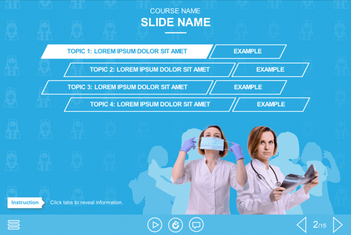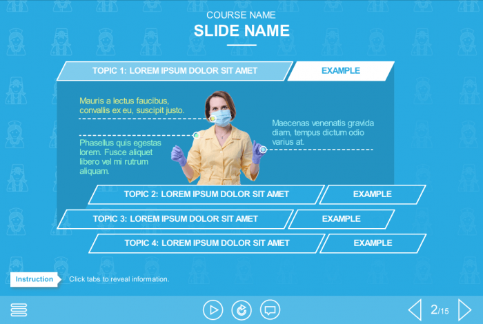 Blue Vertical Accordion — Storyline Template. The unique eLearning template is designed with Articulate Storyline 2 authoring tool. It is composed of 4 main tabs to display the theoretical information, and each main tab contains an additional tab with the example course materials. This template would be an excellent choice to create a powerful training course. It includes cutout photos of a handsome female medician.
