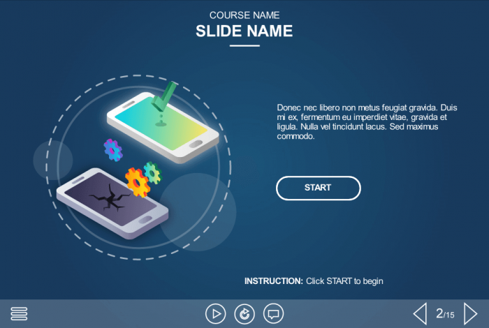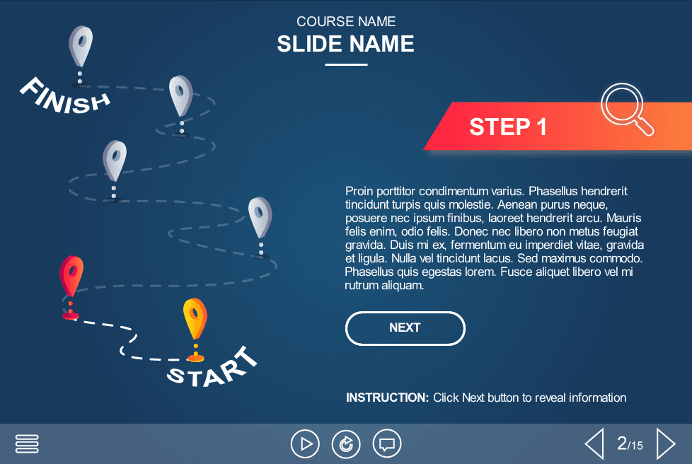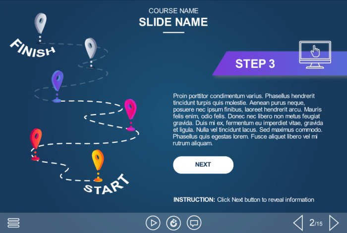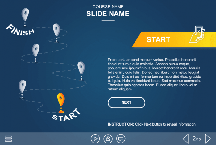 Five Steps — Storyline Template. The unique eLearning template is designed with Articulate Storyline 2 authoring tool. It is composed of 7 slides invented to reveal the course information. The user must click on the Start and Next button to get the training materials. The template contains an interactive map with markers that is placed at the left part of the screen. It would be an excellent choice to create a powerful training course.