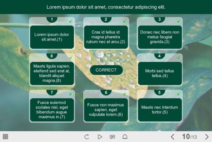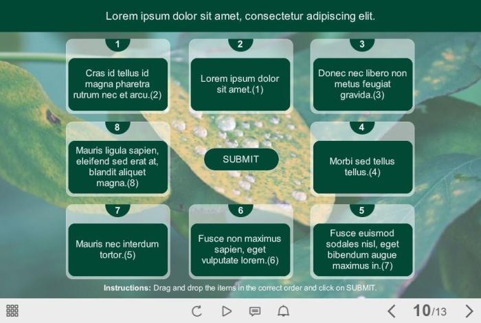 Drag and Drop Quiz — Storyline Template. The eLearning interaction would be a great choice to check learner’s knowledge. It contains 8 draggable boxes that should be dragged to the appropriate fields in the correct order. After dragging all objects and clicking on the SUBMIT button, the user will get the quiz result. It is possible to try again in case of an unsuccessful attempt.