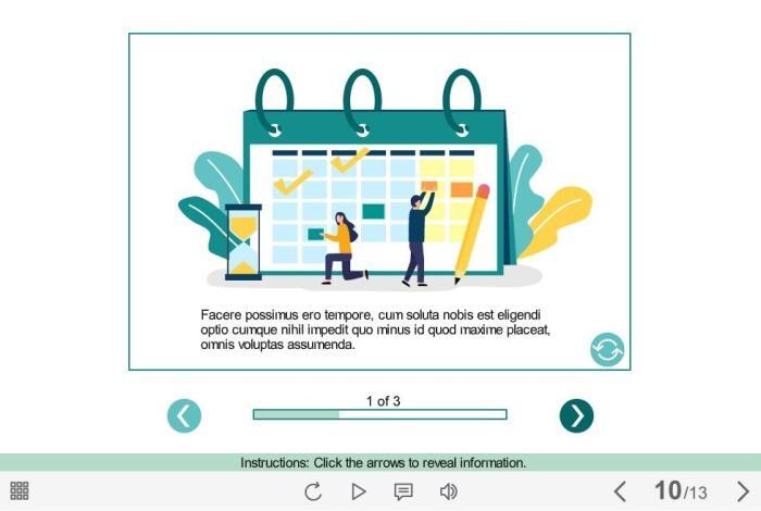 Flip Cards Slideshow — Storyline Template. The eLearning interaction would become a great addition for your eCourse. The slideshow is composed of 3 slides, each of them contains a flip card. The user must click on the left and right arrows to switch between the slides, and a button with coup icon to view all learning materials on each slide. The template is developed with Articulate Storyline 2 authoring tool. It is compatible with the most recent Storyline 3 / 360 versions. All you need is just to paste the template into your project and to fill it with own learning materials. Try to create better courses with our amazing templates!