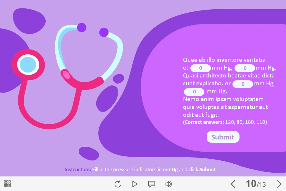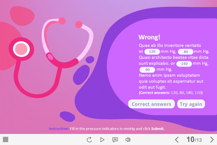 Quiz Fill-in the Blank — Storyline 3 / 360 Template. The eLearning interaction slide would become a great addition for your eCourse. The template contains 3 questions with fill-in blanks. The user must give the correct answers to all the questions to complete the quiz. It is possible to display the correct answer if the learner answered incorrectly. The template is developed with Articulate Storyline 3 / 360 authoring tool. All you need is just to paste the template into your project and to fill it with own learning materials. Try to create better courses with our amazing templates!