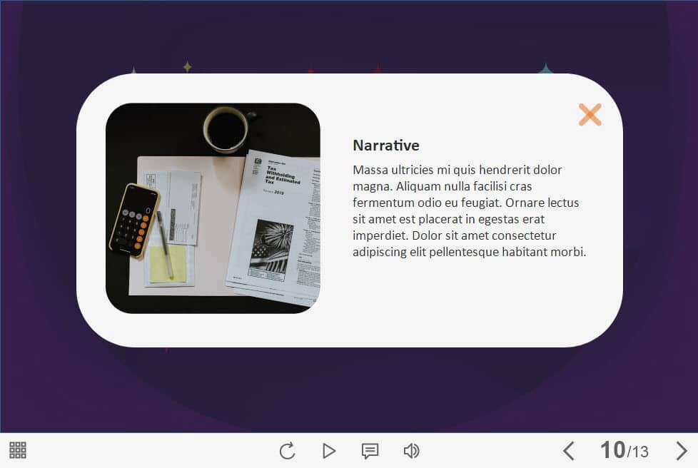 Colorful Stars — Storyline 3 / 360 Template. The eLearning interaction slide would become a great addition for your eCourse. It contains 6 clickable objects designed as stars. The user must click on each of them to reveal the additional information in pop-ups. The template is compatible with Storyline 3 / 360 software. All you need is just to paste the template into your project and to fill it with own learning materials. Try to create better courses with our amazing Articulate Storyline templates!