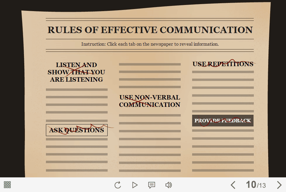 Clickable Newspaper Subheadings — Storyline 3 / 360 Template. The eLearning interaction slide would become a great addition for your eCourse. It contains 5 buttons designed as newspaper subheadings. The user must click on them to reveal the additional information in pop-ups. The template is compatible with Storyline 3 / 360 software. All you need is just to paste the template into your project and to fill it with own learning materials. Try to create better courses with our amazing Articulate Storyline templates!