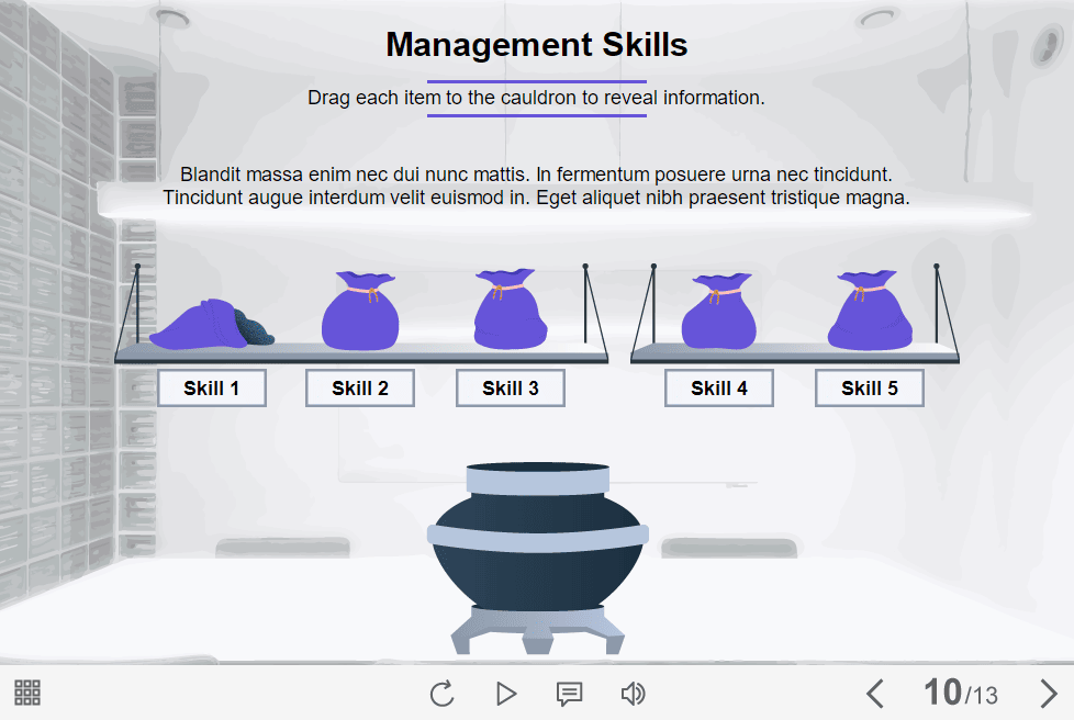 Management Skills — Storyline 3 / 360 Template. The eLearning interaction slide would become a great addition for your eCourse. It contains 5 draggable objects designed as pouches. The user must drag and drop each of them on the cauldron to reveal the additional information in pop-ups. The template is compatible with Storyline 3 / 360 software. All you need is just to paste the template into your project and to fill it with own learning materials. Try to create better courses with our amazing Articulate Storyline templates!