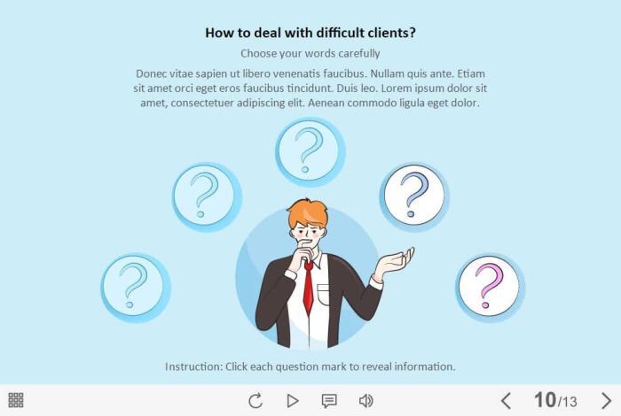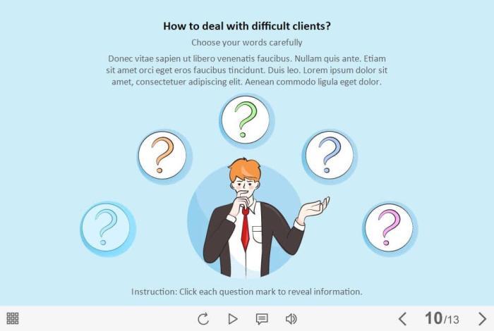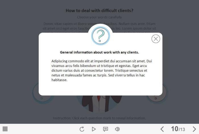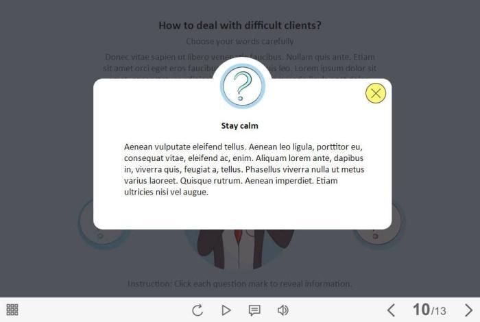 Question Mark Buttons — Storyline 3 / 360 Template. The eLearning interaction slide would become a great addition for your eCourse. It contains five clickable objects designed as circles with question mark icons. The user must click on each of them to reveal the additional information in pop-up window. The template is compatible with Storyline 3 / 360 software. All you need is just to paste the template into your project and to fill it with own learning materials. Try to create better courses with our amazing Articulate Storyline templates!