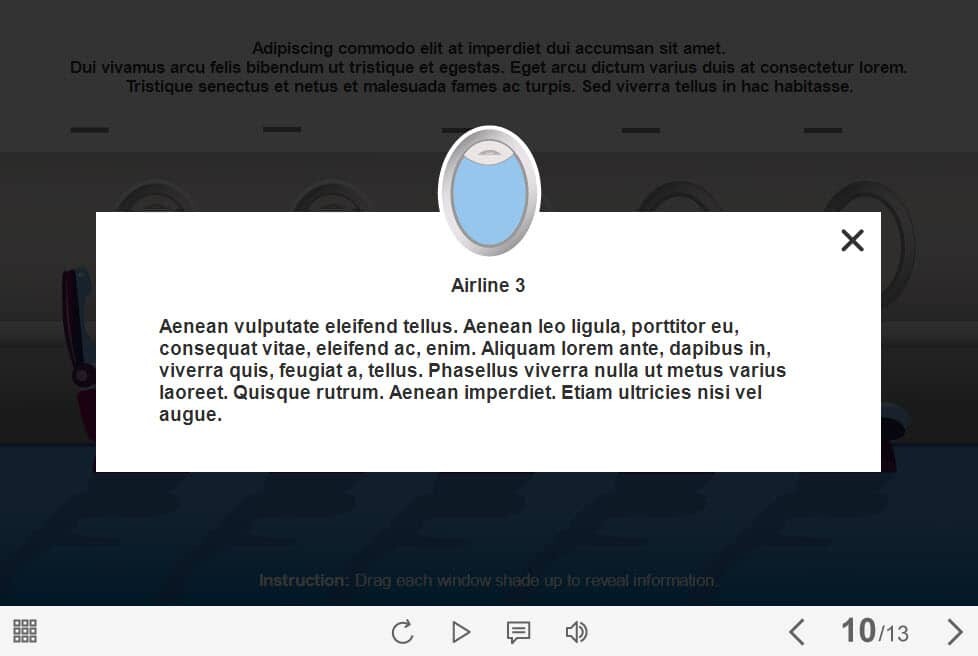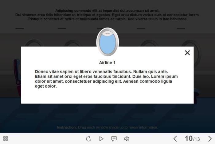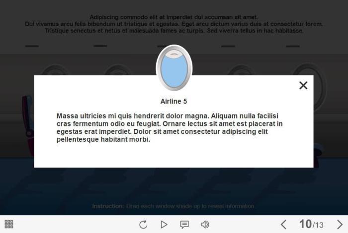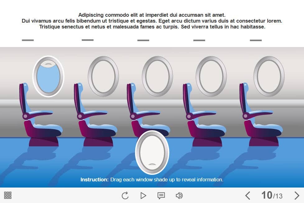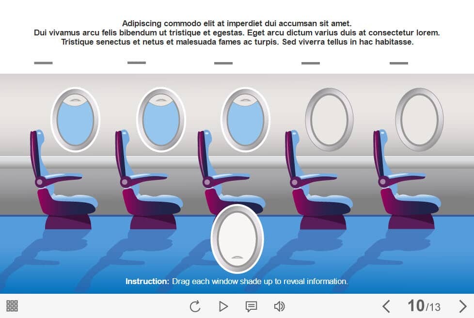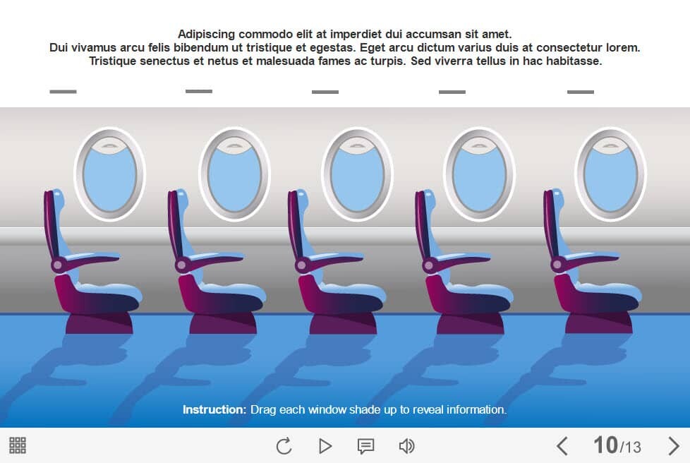 Drag and Drop the Window Shades — Storyline 3 / 360 Template. The eLearning interaction slide would become a great addition for your eCourse. It contains one draggable object designed as window shade, and five target areas. The user must drag and drop the object on the areas to reveal the additional information in pop-ups. The template is compatible with Storyline 3 / 360 software. All you need is just to paste the template into your project and to fill it with own learning materials. Try to create better courses with our amazing Articulate Storyline templates!