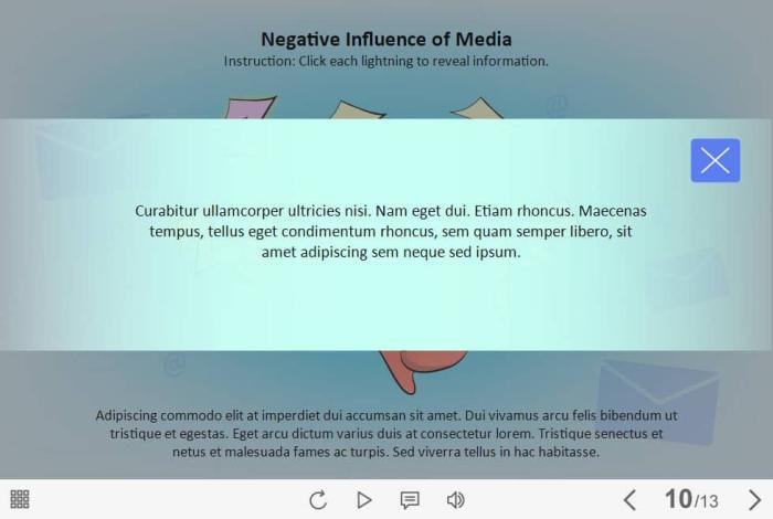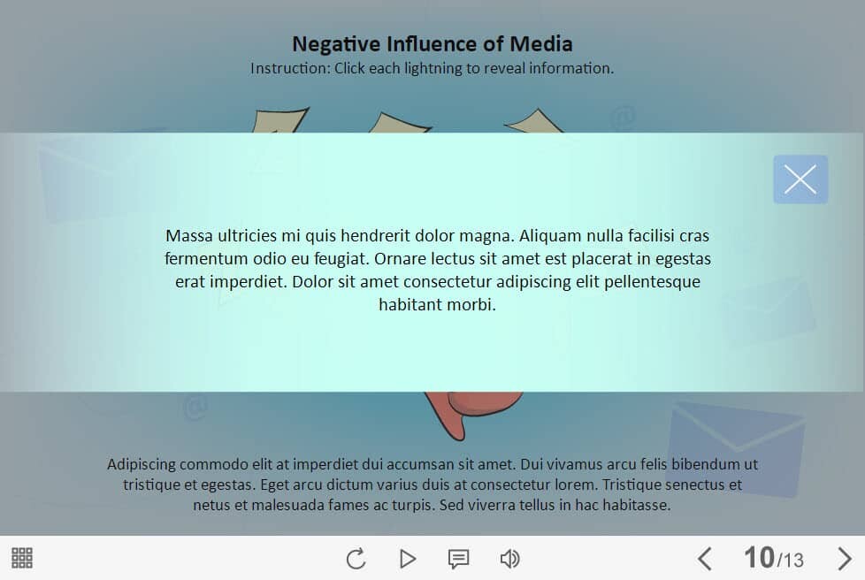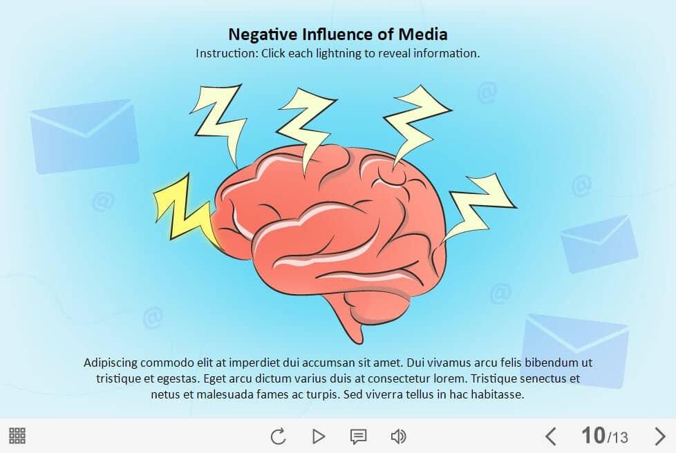 Clickable Lightnings — Storyline 3 / 360 Template. The eLearning interaction slide would become a great addition for your eCourse. It contains five clickable objects designed as lightnings. The user must click on each of them to reveal the additional information. The template is compatible with Storyline 3 / 360 software. All you need is just to paste the template into your project and to fill it with own learning materials. Try to create better courses with our amazing Articulate Storyline templates!