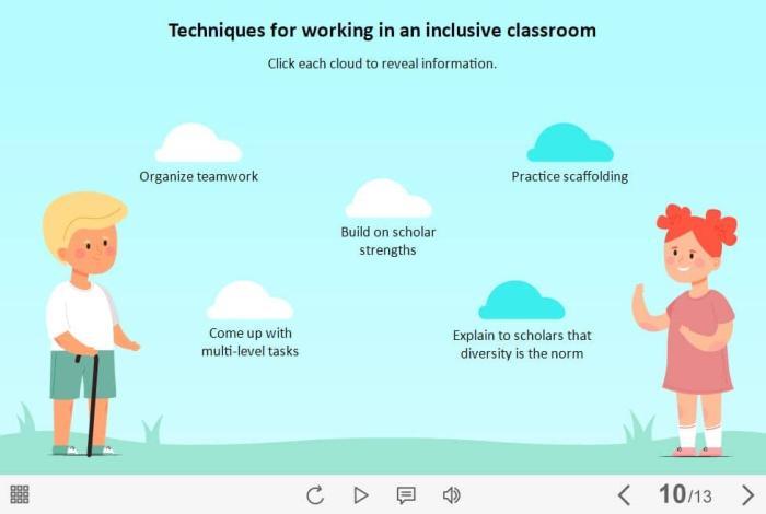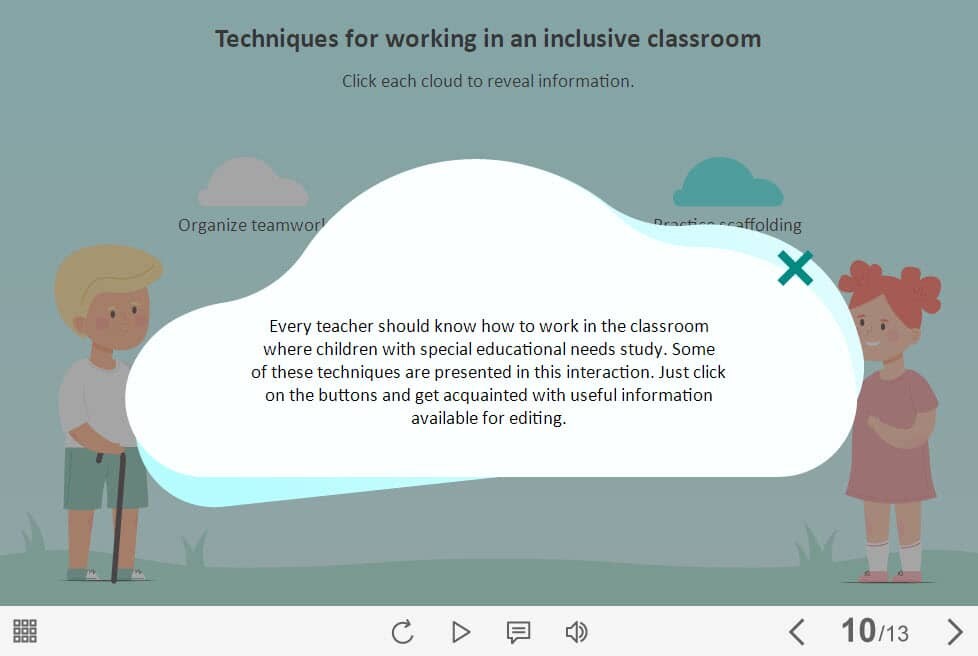 Clickable Clouds — Storyline 3 / 360 Template. The eLearning interaction slide would become a great addition for your eCourse. It contains five clickable objects designed as clouds. The user must click on each of them to reveal the additional information in pop-ups. The template is compatible with Storyline 3 / 360 software. All you need is just to paste the template into your project and to fill it with own learning materials. Try to create better courses with our amazing Articulate Storyline templates!