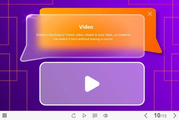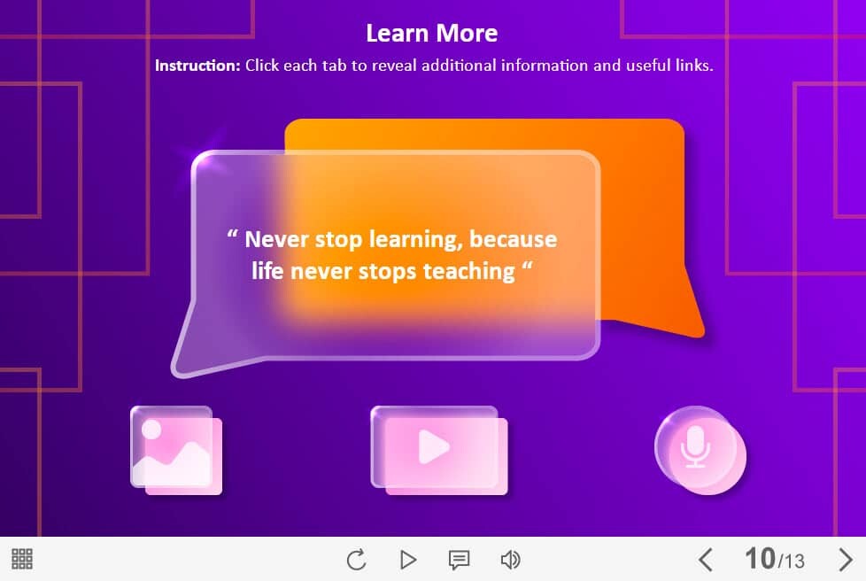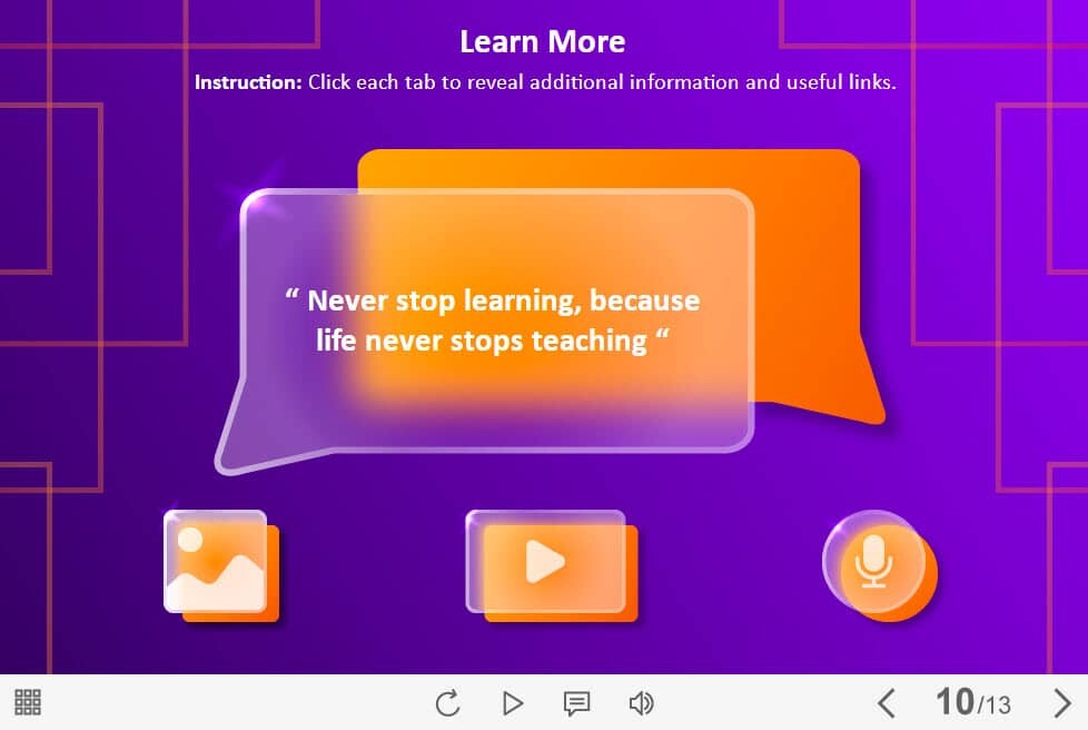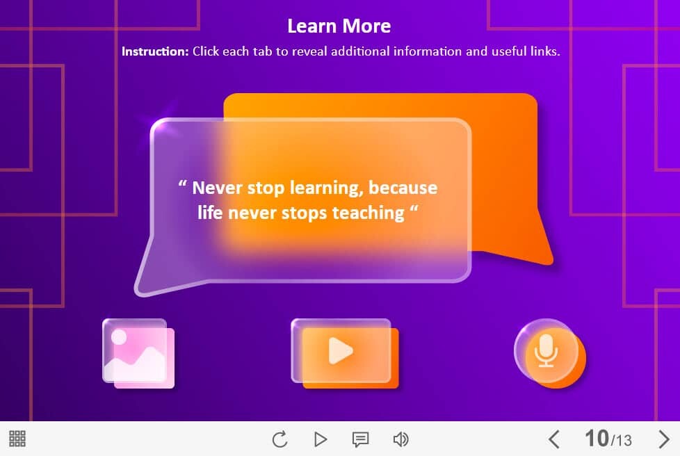 Three Clickable Icons — Storyline 3 / 360 Template. The eLearning interaction slide would become a great addition for your eCourse. It contains three tabs that are arranged at the bottom part of the screen. The user must click on each of them to reveal the additional information. The template is compatible with Storyline 3 / 360 software. All you need is just to paste the template into your project and to fill it with own learning materials. Try to create better courses with our amazing Articulate Storyline templates!