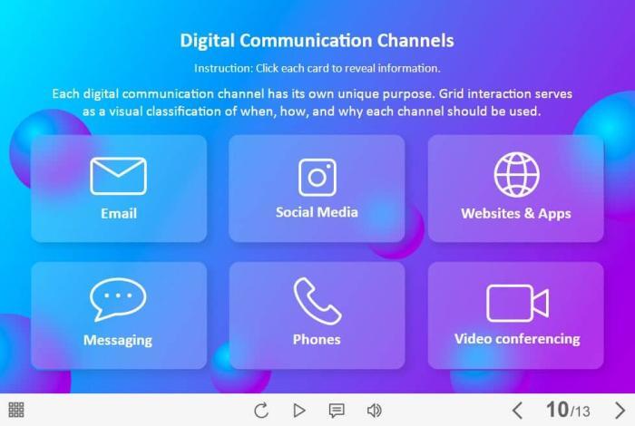 Digital Communication Channels — Storyline 3 / 360 Template. The eLearning interaction slide would become a great addition for your eCourse. It contains six clickable objects designed as cards. The user must click on each of them to reveal the additional information in pop-up windows. The template is compatible with Storyline 3 / 360 software. All you need is just to paste the template into your project and to fill it with own learning materials. Try to create better courses with our amazing Articulate Storyline templates!