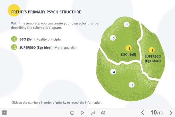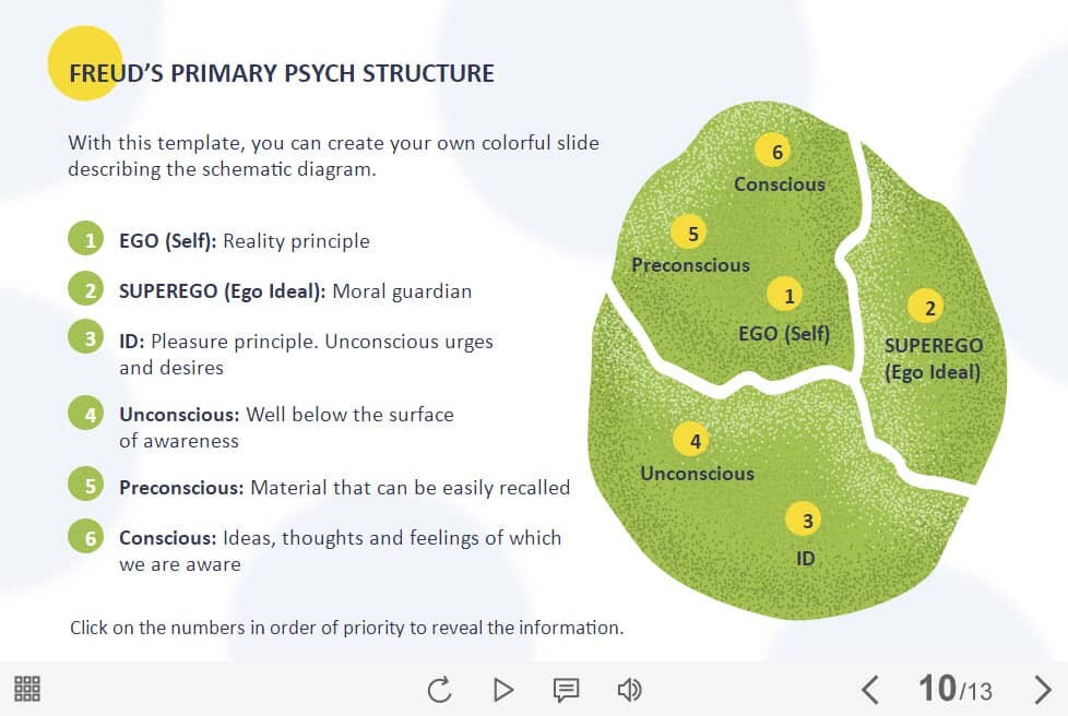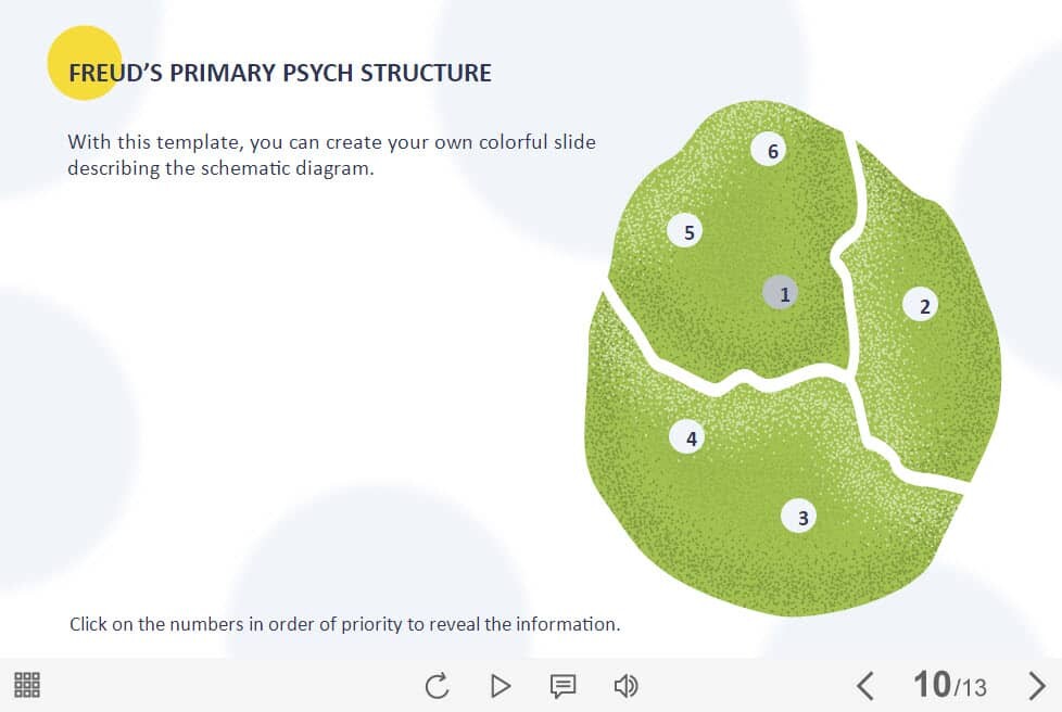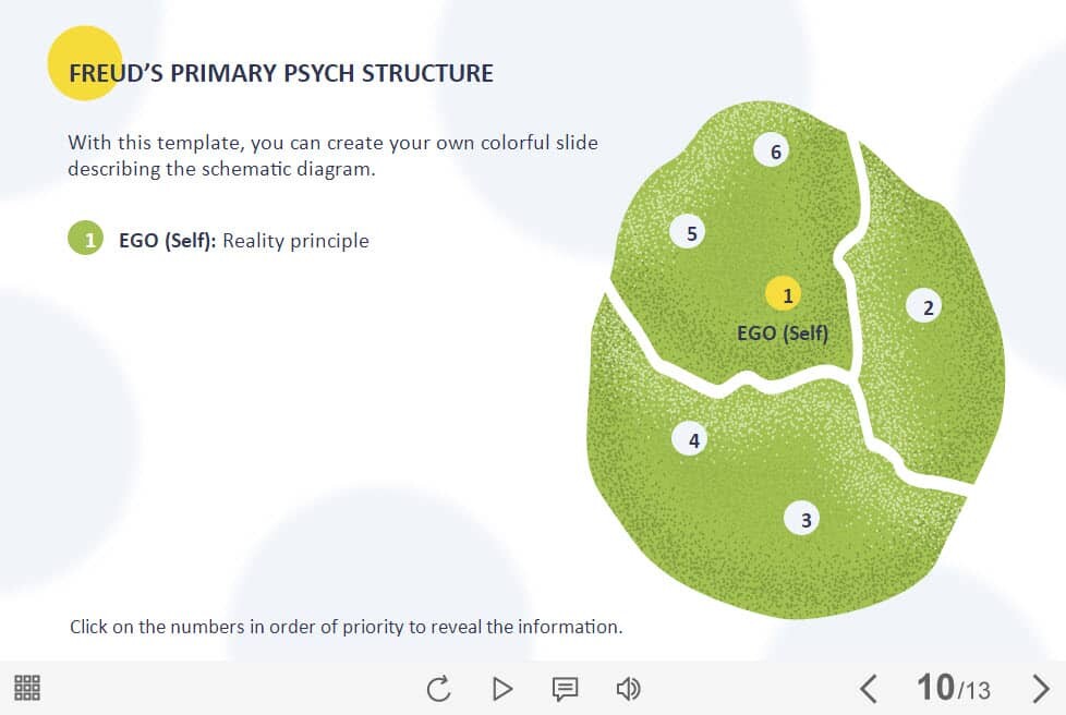 Primary Psych Structure — Storyline 360 Template. The eLearning interaction slide would become a great addition for your eCourse. It contains six round buttons with numbers. The user must click on each of them to reveal the additional information. The template is compatible with Storyline 360 software. All you need is just to paste the template into your project and to fill it with own learning materials. Try to create better courses with our amazing Articulate Storyline templates!