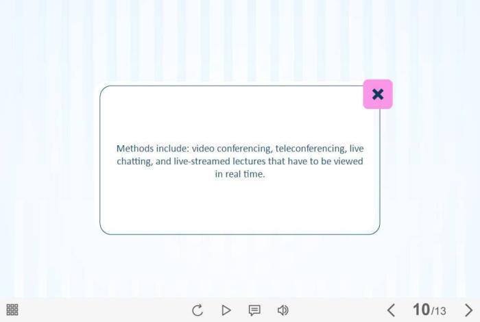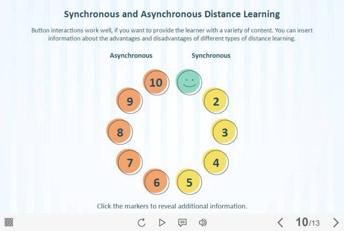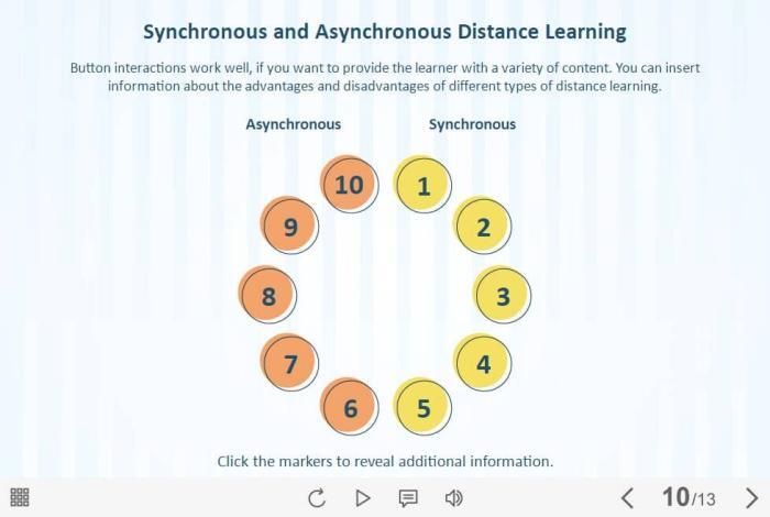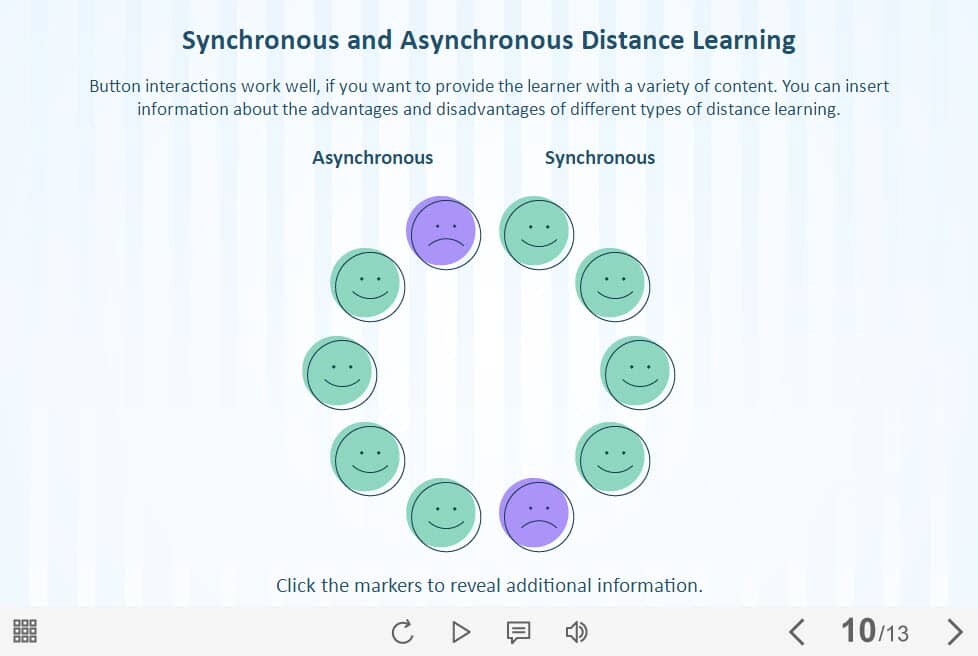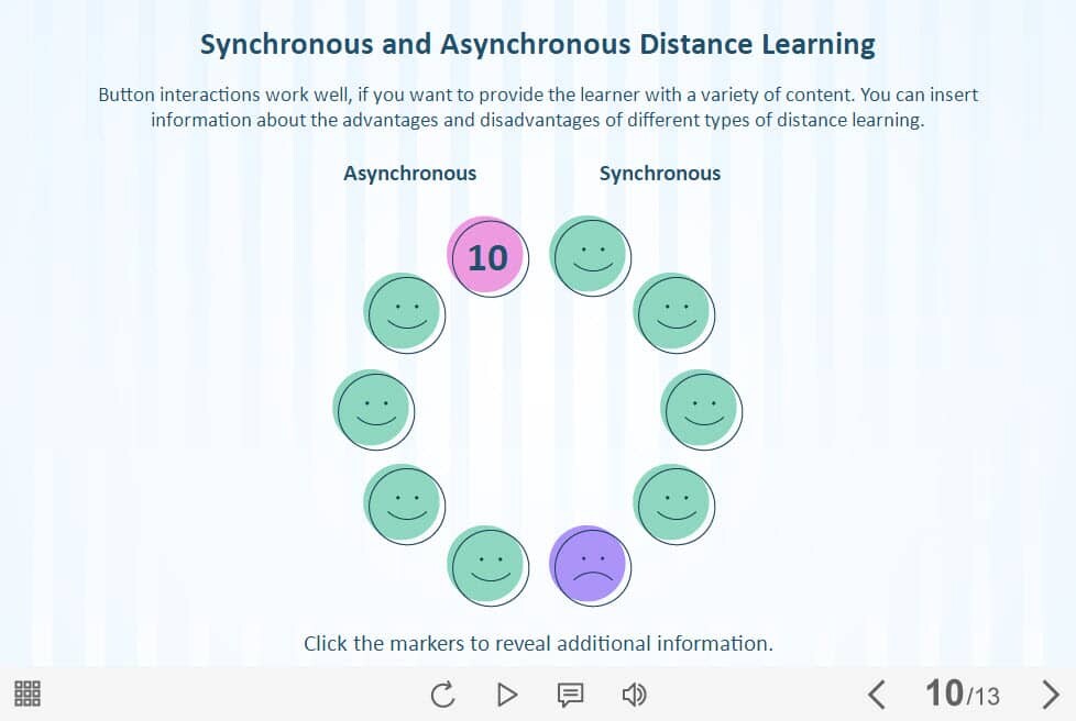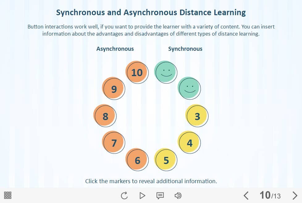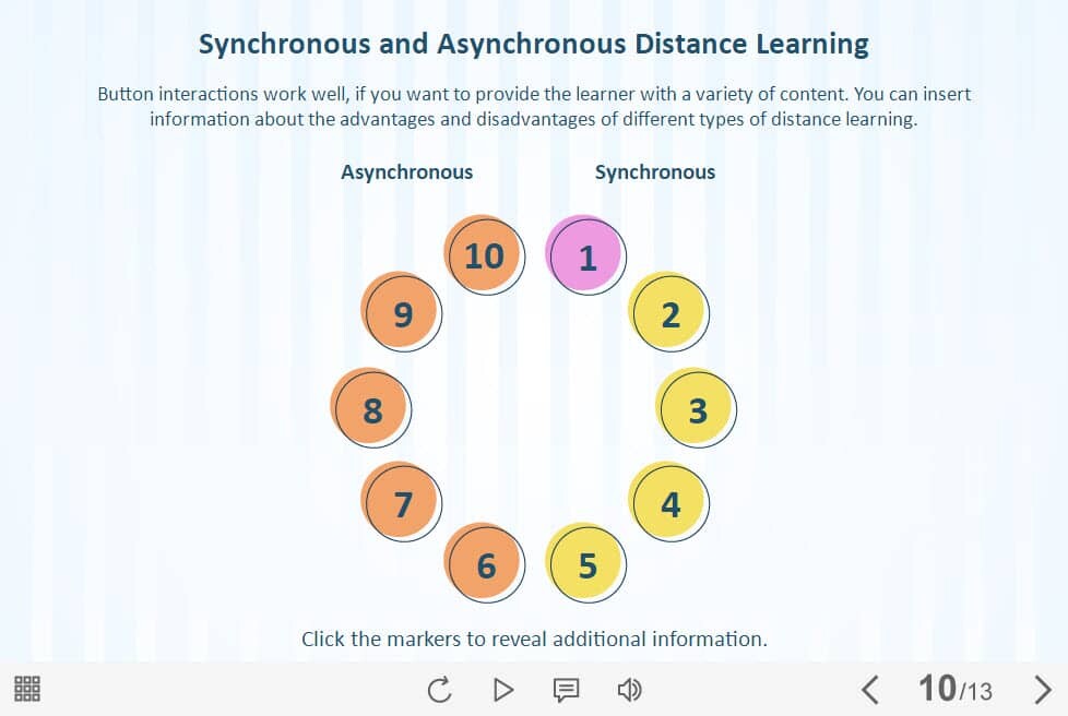 Distance Learning — Storyline 3 / 360 Template. The eLearning interaction slide would become a great addition for your eCourse. It contains ten buttons with numbers that are arranged in the cemter of a screen. The user must click on each of them to reveal the additional information in pop-ups. The template is compatible with Storyline 360 software. All you need is just to paste the template into your project and to fill it with own learning materials. Try to create better courses with our amazing Articulate Storyline templates!
