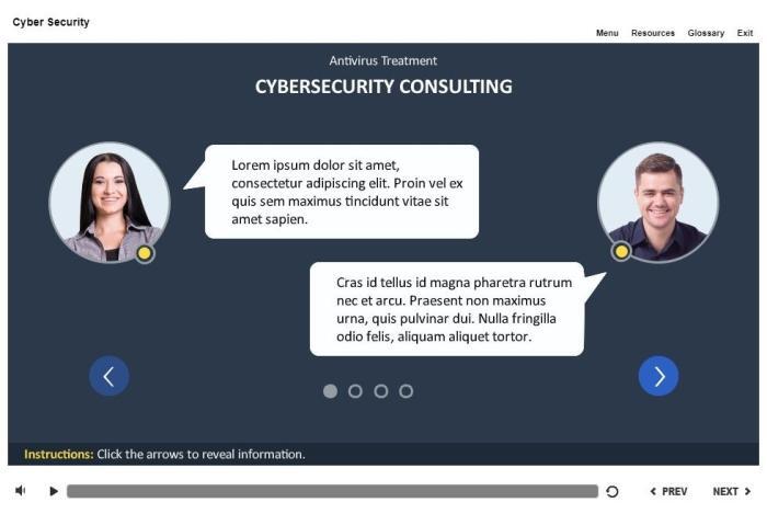Cybersecurity Consulting — Storyline Template. The unique eLearning interaction is designed with Articulate Storyline 2 software. It is fully compatible with the most recent versions: Storyline 3 and 360. The template represents a conversation between a support staff member and the person who asked for help. The user must click on the left and right arrows to switch between the slides and to reveal the materials. The template slide is a ready-made product: all you need is to insert it into the projects and fill with own training content. We recommend to launch it on the devices with the screen size more than 7 inches. We’ve collected lots of Articulate Storyline templates to speed up the course development and to save you from routine work.
