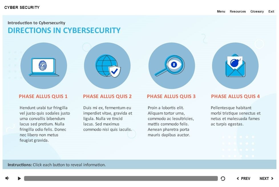 Clickable Round Icons — Storyline Template. The unique eLearning interaction is designed with Articulate Storyline 2 software. It is fully compatible with the most recent versions: Storyline 3 and 360. The template contains four icons placed at the top of the screen. The user must click on them to reveal the additional materials. The template slide is a ready-made product: all you need is to insert it into the projects and fill with own training content. We recommend to launch it on the devices with the screen size more than 7 inches. We’ve collected lots of Articulate Storyline templates to speed up the course development and to save you from routine work.