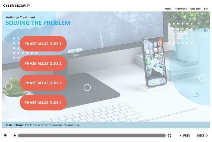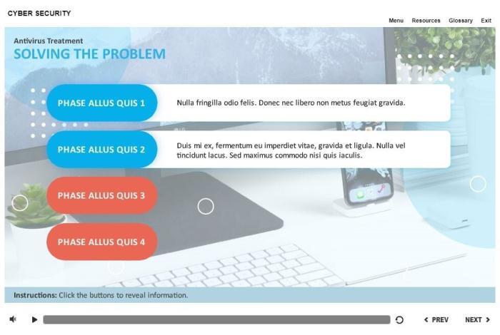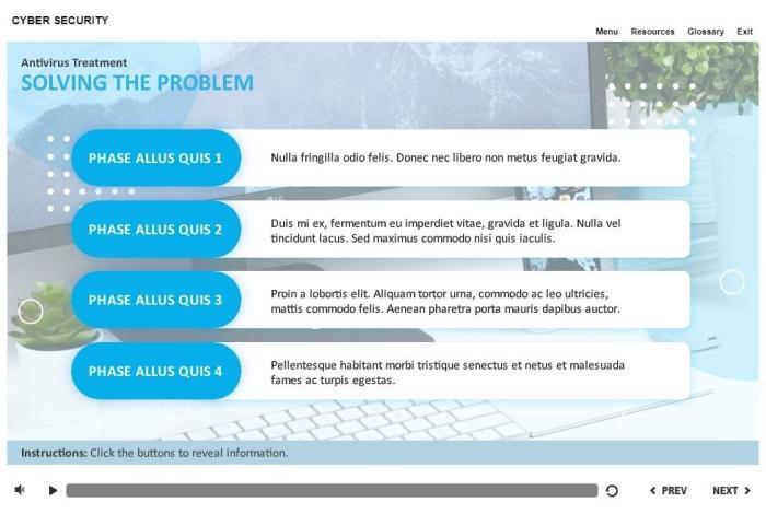 Four Steps — Storyline Template. The unique eLearning interaction is designed with Articulate Storyline 2 software. It is fully compatible with the most recent versions: Storyline 3 and 360. The template contains four red buttons placed at the left part of the screen. The user must click on them to reveal the additional materials. The template slide is a ready-made product: all you need is to insert it into the projects and fill with own training content. We recommend to launch it on the devices with the screen size more than 7 inches. We’ve collected lots of Articulate Storyline templates to speed up the course development and to save you from routine work.