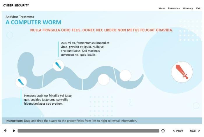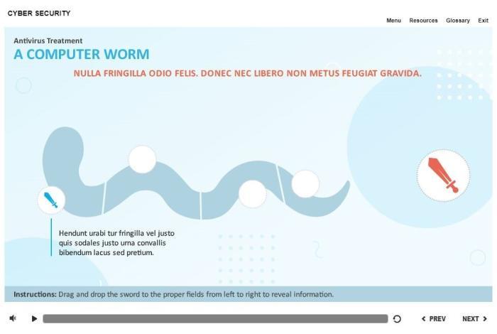 Drag`n`drop the Sword — Storyline Template. The unique eLearning interaction is designed with Articulate Storyline 2 software. It is fully compatible with the most recent versions: Storyline 3 and 360. The user must drag the sword to the appropriate field sequentally from left to right to reveal the additional information. The template slide is a ready-made product: all you need is to insert it into the projects and fill with own training content. We recommend to launch it on the devices with the screen size more than 7 inches. We’ve collected lots of Articulate Storyline templates to speed up the course development and to save you from routine work.