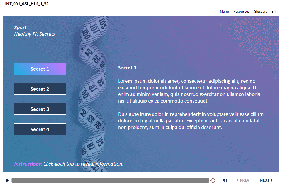 Healthy Fit Secrets Tabs — Storyline Template. The unique eLearning interaction is designed with Articulate Storyline 360 software. It is fully compatible with Articulate 3. The template contains 4 tabs placed at the left side of the screen. The user must click each of them to reveal the additional materials. The template is a ready-made product: all you need is to insert it into the projects and fill with own training content. It’s recommended to launch it on the devices with the screen size more than 7 inches.