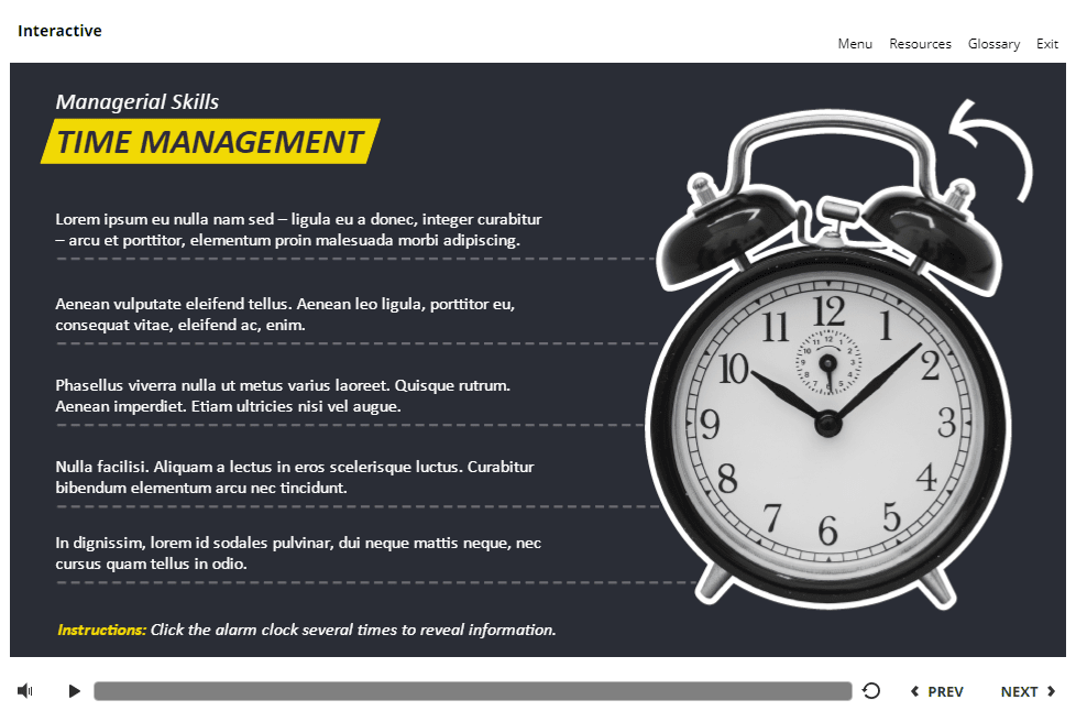 Clickable Clocks — Storyline 3 Template. The unique eLearning interaction is designed with Articulate Storyline 3 software. It is fully compatible with Articulate 360. The template contains one clickable object – clocks. The user must click it several times to reveal the additional materials. The template slide is a ready-made product: all you need is to insert it into the projects and fill with own training content. It’s recommended to launch it on the devices with the screen size more than 7 inches.
