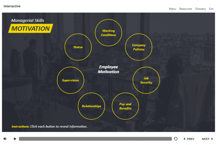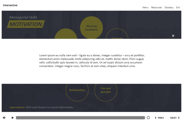 Employee Motivation Buttons — Storyline 3 Template. The unique eLearning interaction is designed with Articulate Storyline 3 software. It is fully compatible with Articulate 360. The template contains 7 round buttons placed at the right part of the screen. The user must click each of them to reveal the additional materials. The template slide is a ready-made product: all you need is to insert it into the projects and fill with own training content. It’s recommended to launch it on the devices with the screen size more than 7 inches.