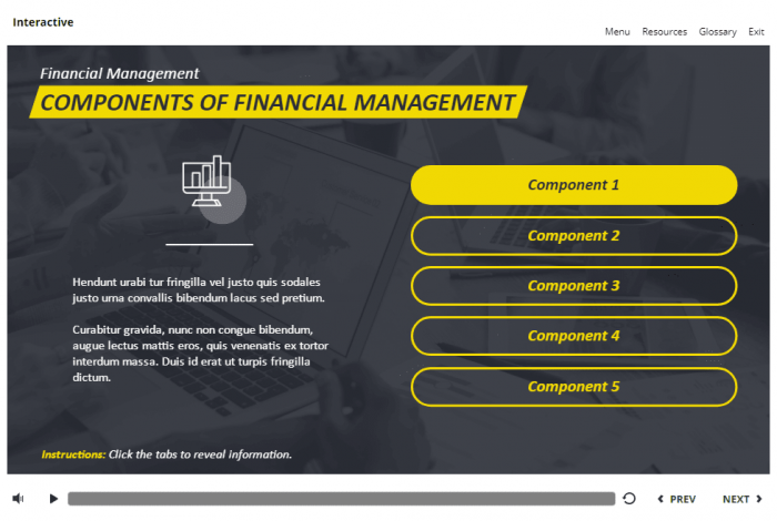 Right-Side Vertical Tabs — Storyline 3 Template. The unique eLearning interaction is designed with Articulate Storyline 3 software. It is fully compatible with Articulate 360. The template contains 5 tabs placed at the left part of the screen. The user must click each of them to reveal the additional materials. The template slide is a ready-made product: all you need is to insert it into the projects and fill with own training content. It’s recommended to launch it on the devices with the screen size more than 7 inches.