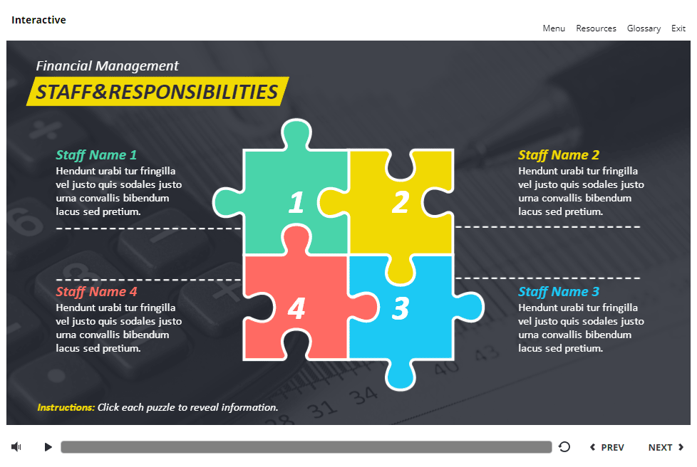 Square Jigsaw Puzzle Buttons — Storyline 3 Template. The unique eLearning interaction is designed with Articulate Storyline 3 software. It is fully compatible with Articulate 360. The template contains 4 clickable objects designed as jigsaw puzzles. The user must click each of them to reveal the additional materials. The template slide is a ready-made product: all you need is to insert it into the projects and fill with own training content. It’s recommended to launch it on the devices with the screen size more than 7 inches.