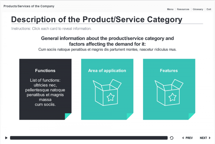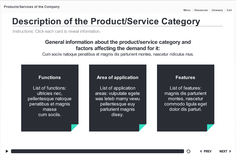Three Flip Cards — Storyline Template. The ready-made eLearning template is designed with Articulate Storyline 2 and is fully compatible with the most recent versions: Storyline 3 and 360. It contains three turquoise flip cards. The user must click on them to reveal the learning materials. The template would be a great choice to create an astonishing e-course. It is published by using the standard Articulate Storyline player frame. All you need is just to insert the slide into the project and to fill it with your eLearning content.