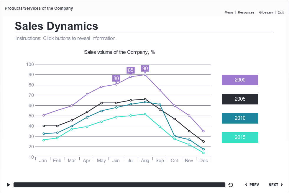Data Comparison Chart — Storyline Template. The ready-made eLearning template is designed with Articulate Storyline 2 and is fully compatible with the most recent versions: Storyline 3 and 360. It contains 4 tabs placed at the right part of the screen. The user must click on them to view the data on a chart and to analyse it. The template would be a great choice to create an astonishing e-course. It is published by using the standard Articulate Storyline player frame. All you need is just to insert the slide into the project and to fill it with your eLearning content.
