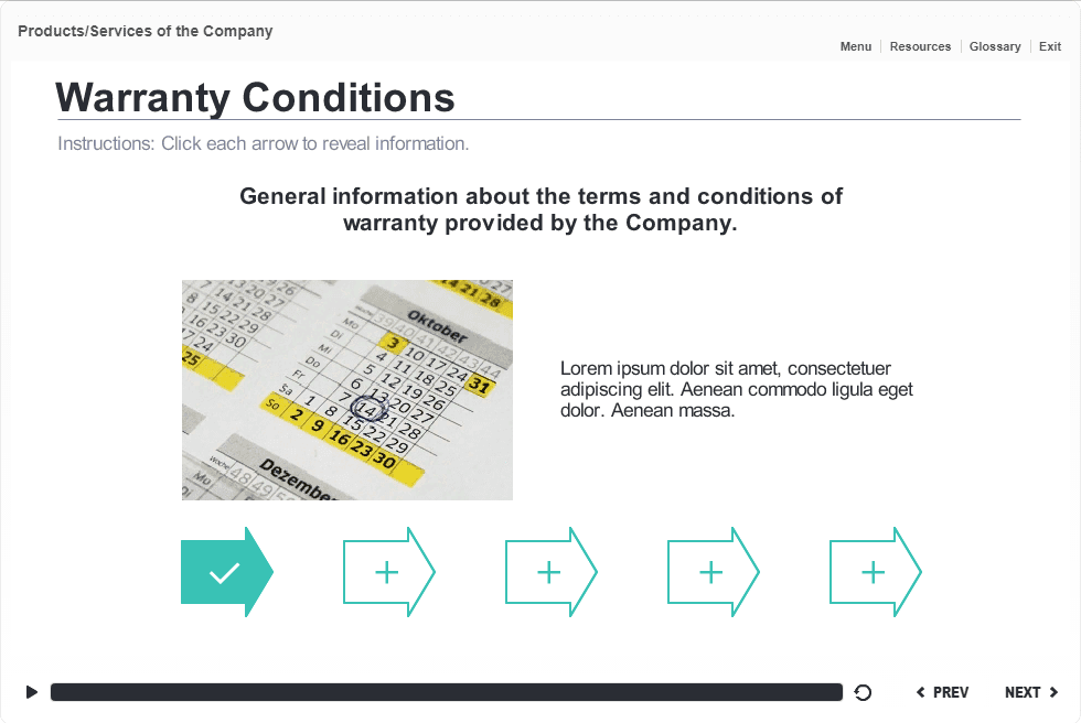 Five Arrow Tabs — Storyline Template. The ready-made eLearning template is designed with Articulate Storyline 2 and is fully compatible with the most recent versions: Storyline 3 and 360. It contains five tabs designed in the form of arrows. The user must click on them to reveal the learning materials. The template would be a great choice to create an astonishing e-course. It is published by using the standard Articulate Storyline player frame. All you need is just to insert the slide into the project and to fill it with your eLearning content.