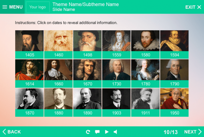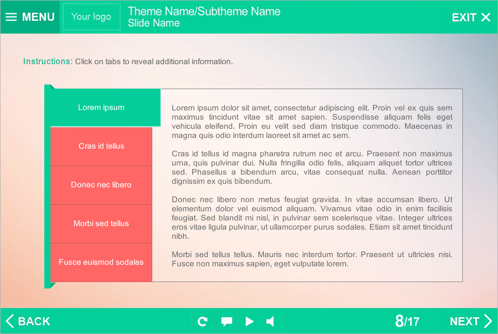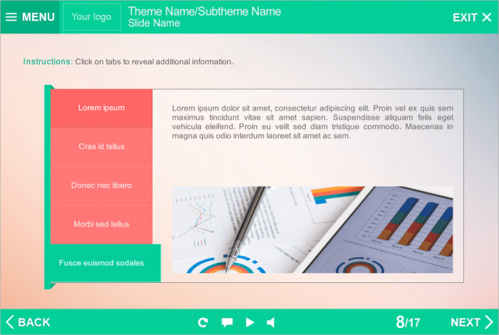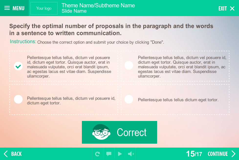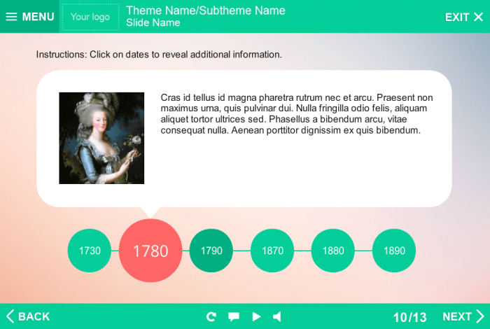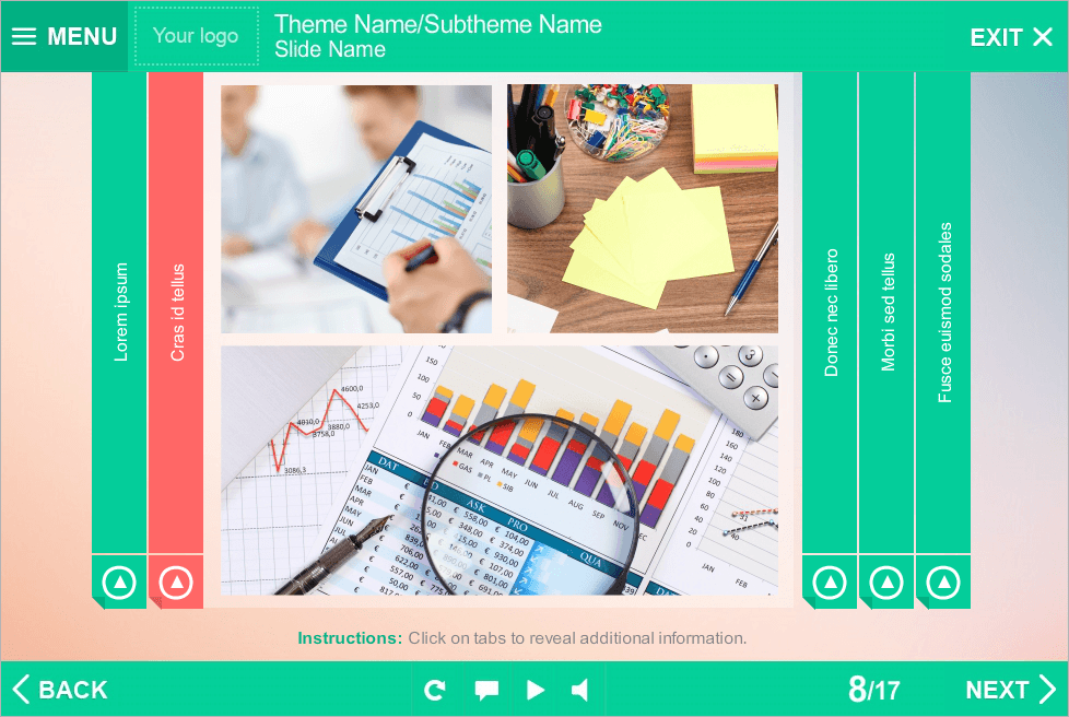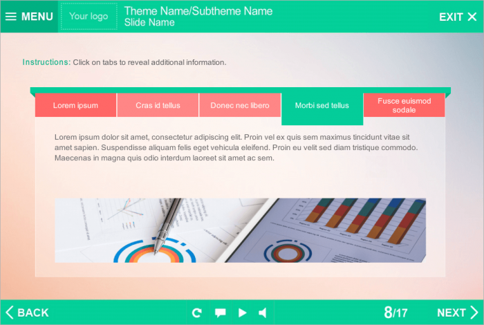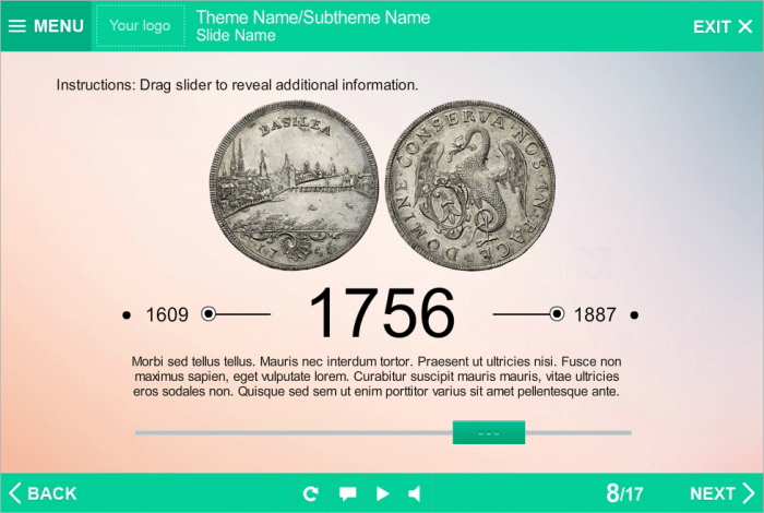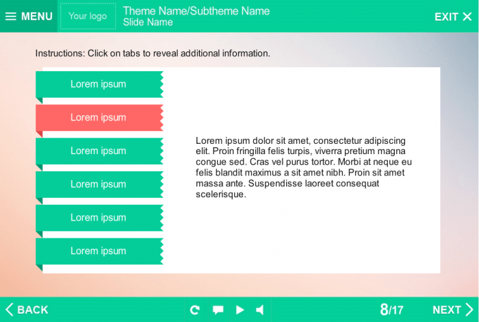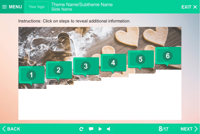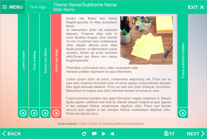 The course player contains character, flip-chart image and three versions of image slides. Different types of interactions invented to display any kind of additional information by clicking on visual objects. All items are already designed and prepared for usage.