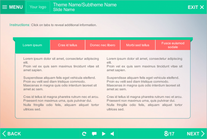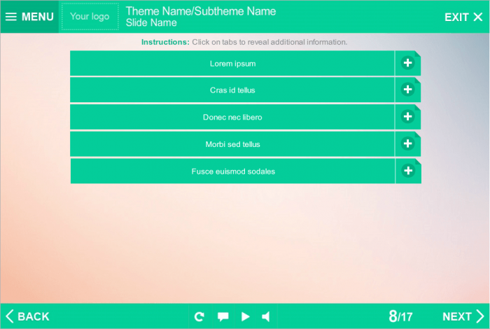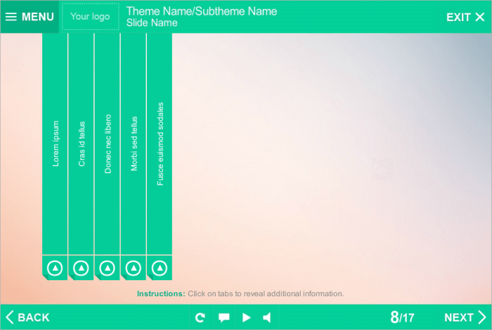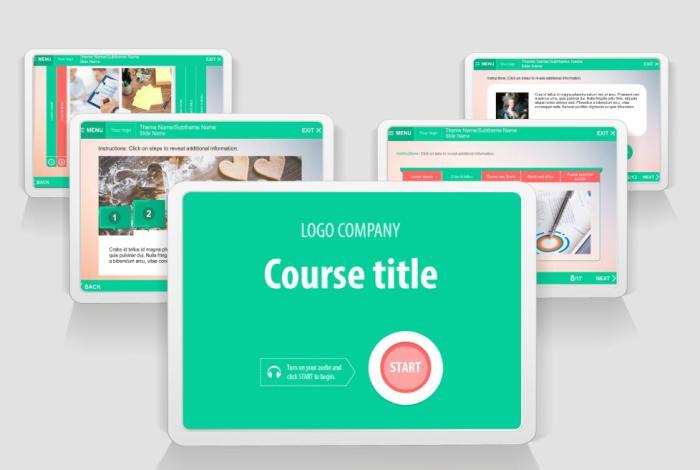 The package consists of 1 course player and 13 interactive slides that have similar design. It is a perfect toolkit for creating your own e-learning courses, suitable both for tablet and PC. Big navigation keys allow to view content on a small screens or mobile phones.