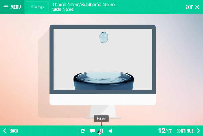- Course player features: custom course map, custom navigation, custom voice/animation control, glossary, resources, closed captions, audio player, video player, quizzes which transfer data to LMS