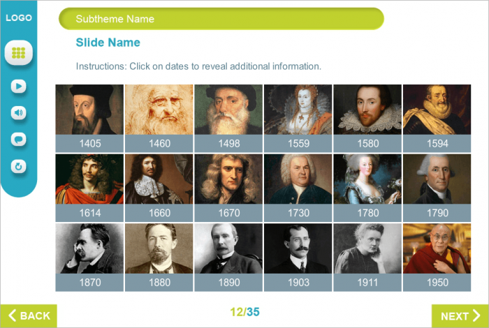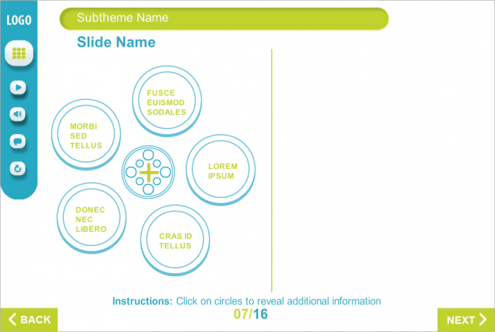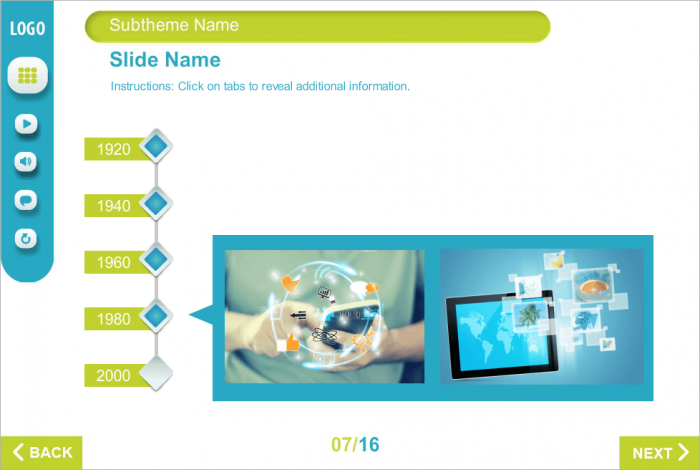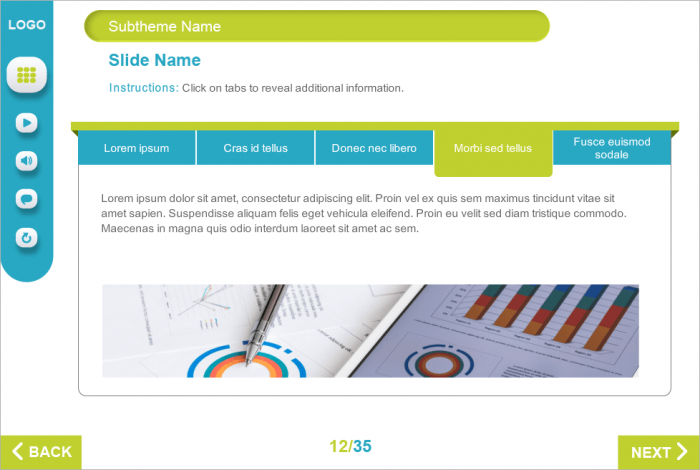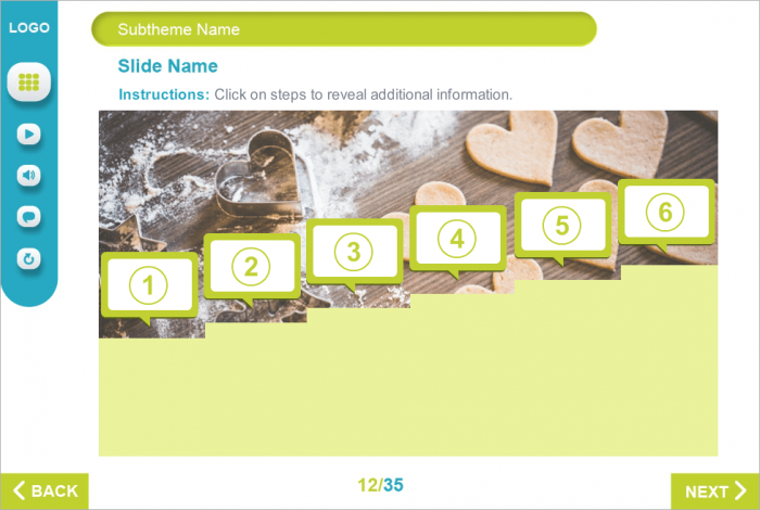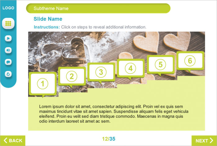 The course player contains character, flip-chart image and three versions of image slides. Different types of interactions invented to display any kind of additional information by clicking on visual objects. All items are already designed and prepared for usage.
